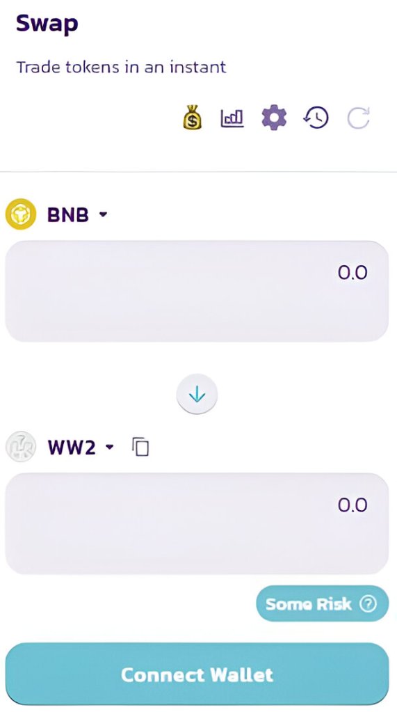 3. Open the browser inside your wallet, and head to ww2coin.com. Then, click on the ‘Buy now’ button below, which takes you to PancakeSwap and loads the $WW2 contract. Make sure the URL is https://pancakeswap.finance/swap.